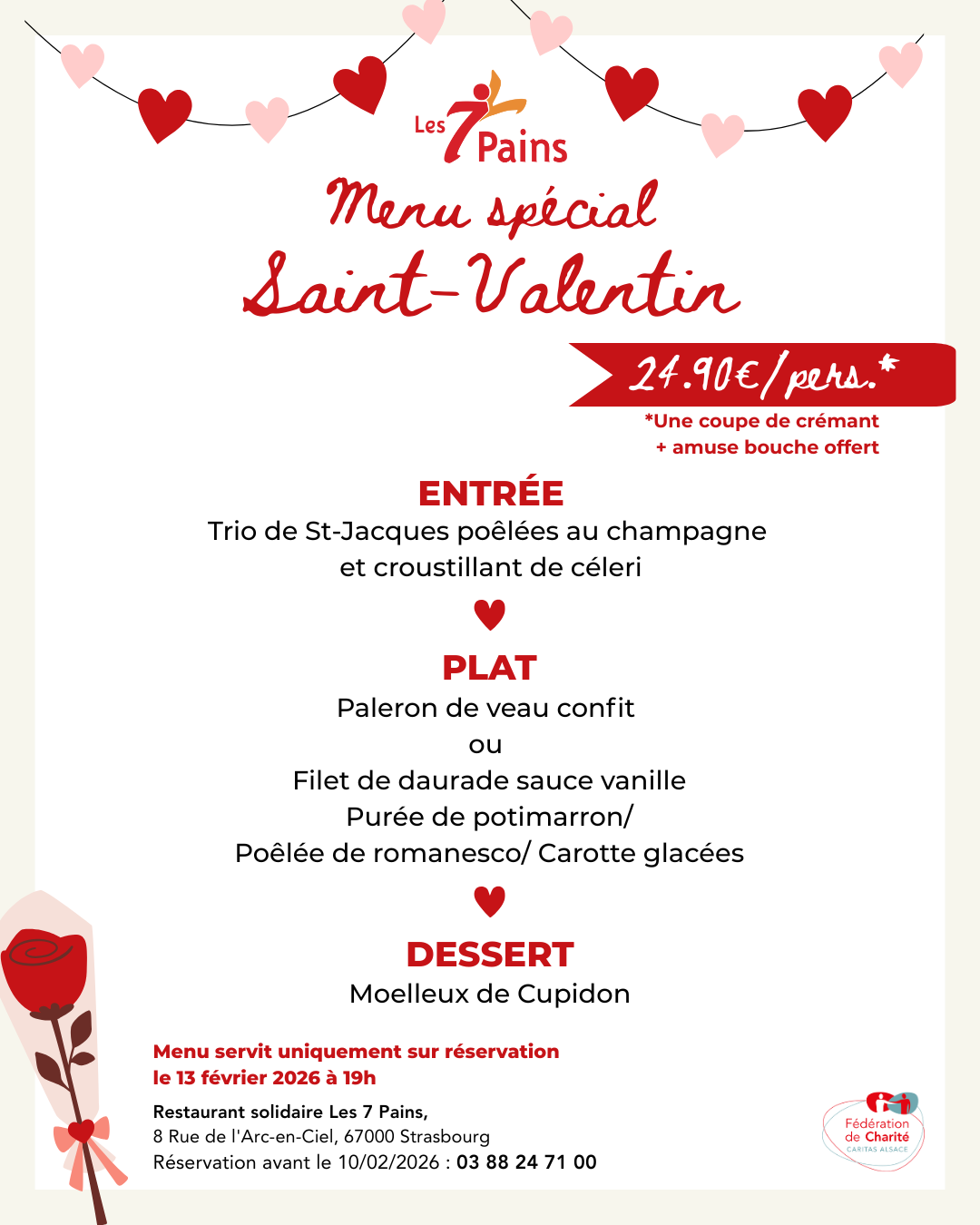 Le restaurant solidaire Les 7 Pains ouvre ses portes exceptionnellement le vendredi 13 février à 19h pour célébrer la Saint-Valentin avec un menu thématique à 24,90 €, servi uniquement sur réservation.